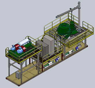 工作時候,將鉆屑甩干機和鉆井液離心機的支架升高到最高處,能夠滿足鉆屑甩干機的鉆屑排放,以及 鉆井液離心機的液相和固相排放,液相的排放可以直接通過重力作用將干凈泥漿流入到儲漿罐或固控系 統中去。