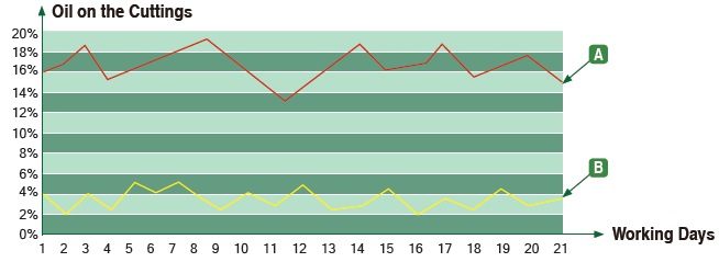 B: 冠能鉆屑甩干機處理后的鉆屑含油量。