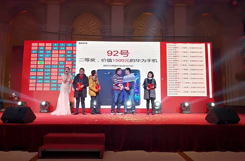 在總經理的帶領下,冠能公司很多同事成了“花粉”,也就是華為的粉絲。2017年年會主題,就是借用的華為公司任總的話“不破樓蘭終不還”。我們也一直弘揚類似華為的奮斗者文化,讓跟隨公司共同奮斗發展的員工,有一個獲得認可的回報。奮斗者不一定成功,但成功者必定奮斗過,我們將繼續努力奮斗。在這幾年年會里,用于抽獎的獎品大部分都是華為產品。今年特等獎是5臺彩色電視機,一等獎是10臺華為PAD,二等獎是20臺華為手機,三等獎是40臺華為手環,四等獎是60臺美的電火鍋。共計獎品135臺。在此,再次恭喜得獎的幸運朋友。